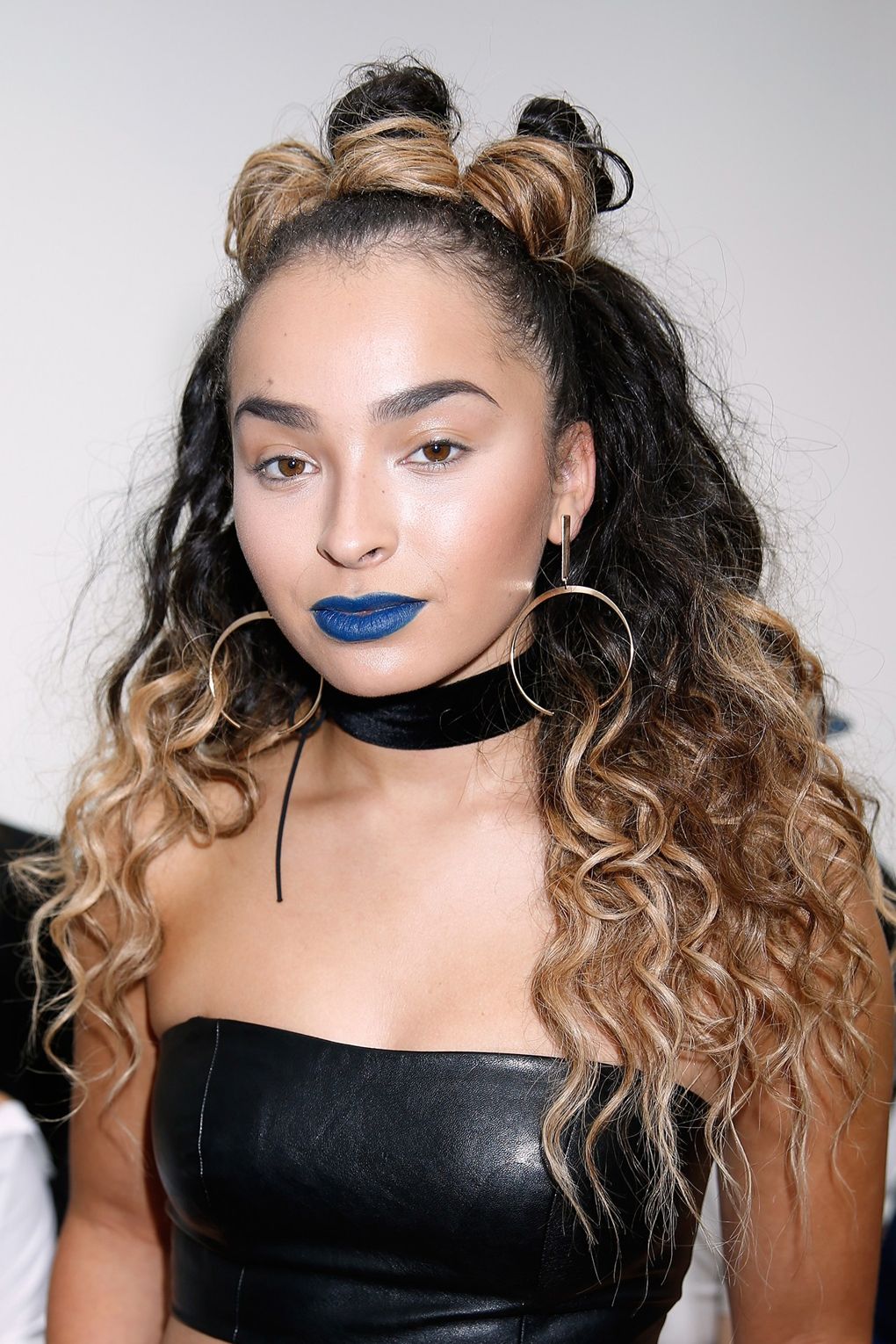 During the London Fashion Week for the Topshop show, sexy Ella Eyre went for an edgy hairstyle. She showed off her bold ombre with 3 top-knots and half down hair.