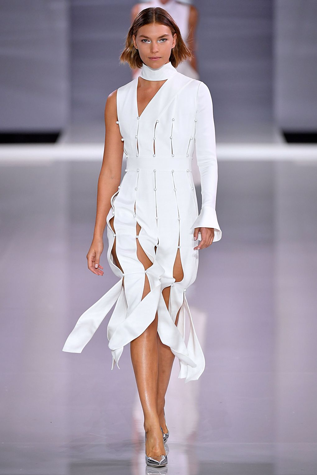 Ralph’s silk-crepe opening look, was studded with rows of glittering buttons and strategically placed slits. It played the flirty peekaboo game to perfection. “It’s very elegant. It’s very simple but there’s something very sexy about it. You don’t have to show it all, you can hint,” she counsels.