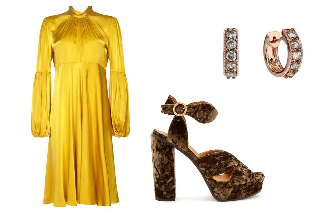 Ghost satin dress, £165 at Ghost.co.uk, Chloé velvet heels, £580 at Matchesfashion.com, Annoushka diamond earrings, £1600 at Harveynichols.com.