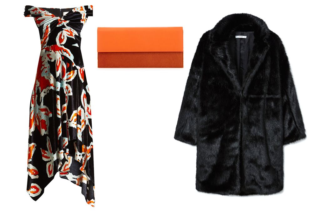 Peter Pilotto velvet dress, £1195 at Matchesfashion.com, London Velvet clutch, £225 at Londonvelvet.co.uk, Mango faux fur coat, £119.99 at Shop.mango.com.
