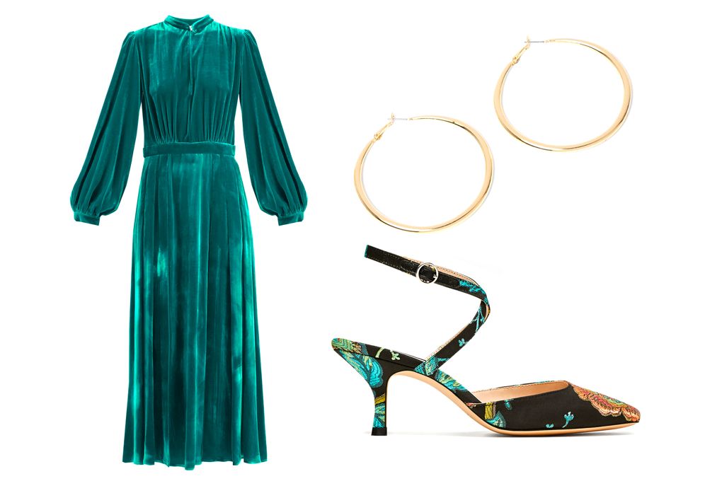 Raquel Diniz dress, £760 at Matchesfashion.com, River Island hoops, £6 at Riverisland.com, Zara kitten heel, £49.99 at Zara.com
