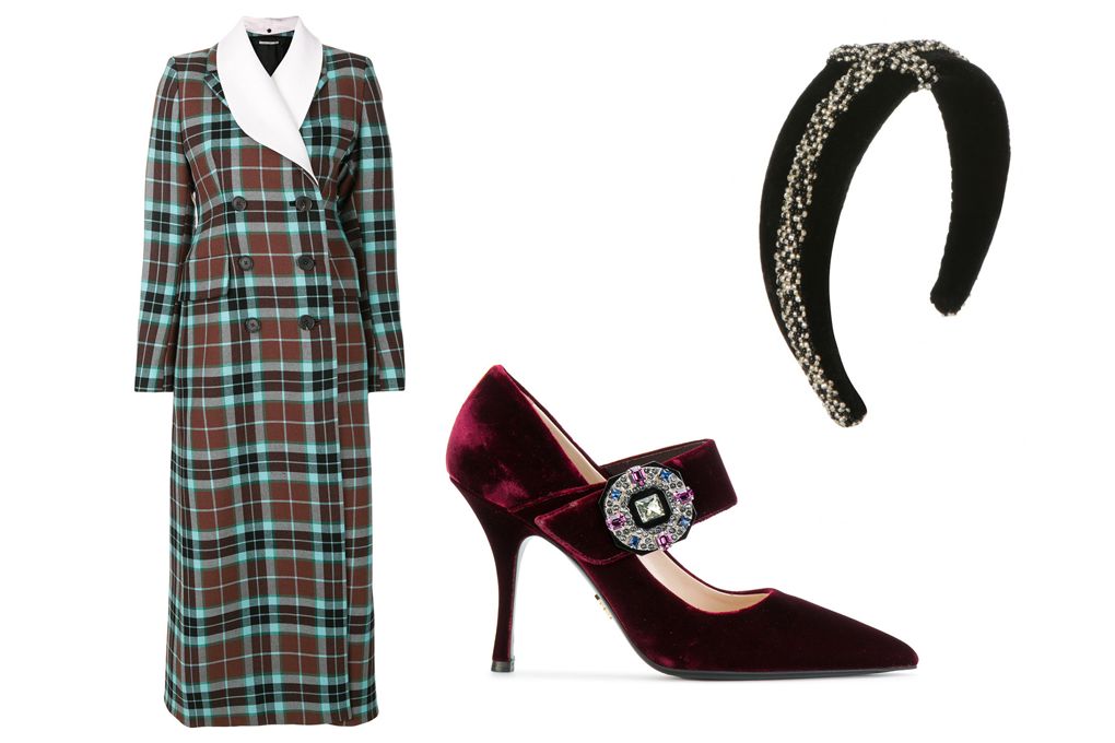 Alessandra Rich dress, £2480 at Matchesfashion.com, Prada velvet heels, £740 at Farfetch.com, Emily London embellished hairband £335 at Harveynichols.com.
