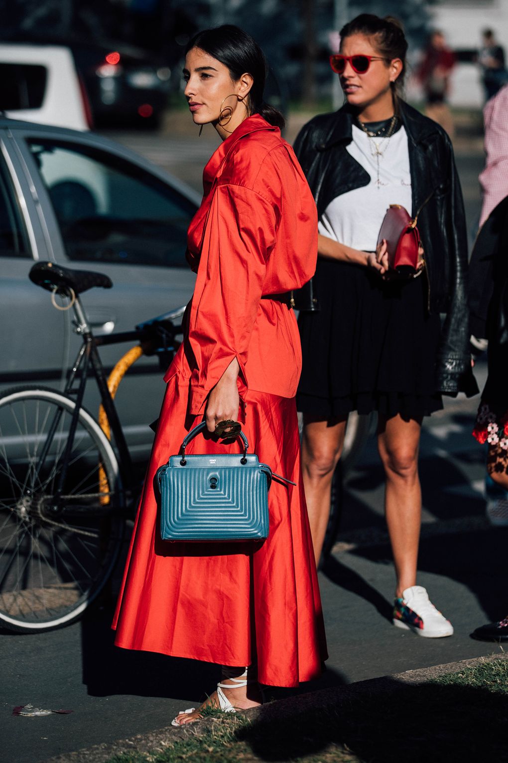 Coral red was having a moment in the flashes and awed stares on and off on the catwalk at Milan Fashion Week. This street style in coral red cue is all about the silhouette. Note how fresh the full skirt to pair up with the blouse combo look.