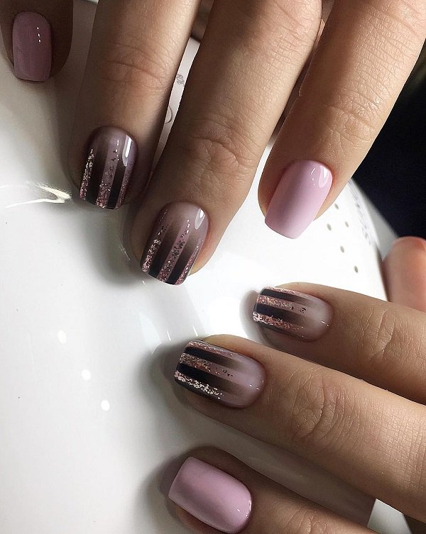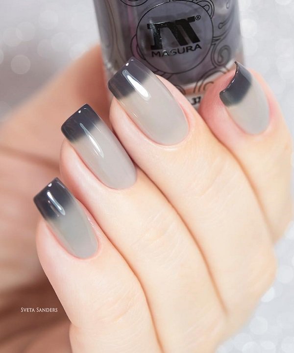A modern version of the French manicure. Two shades do not have a clear passage and gray color is used instead of white on top.