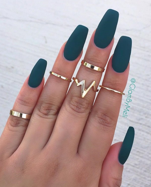 Monochrome matte manicure looks very rich thanks to numerous golden rings.