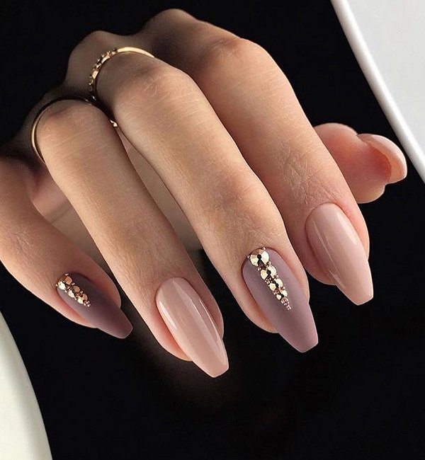 The combination of nude shades and gold colors looks a bit exotic.
