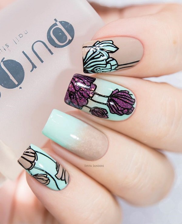 Gentle colors that spill over into each other. Very skillfully made manicure with effective pattern.