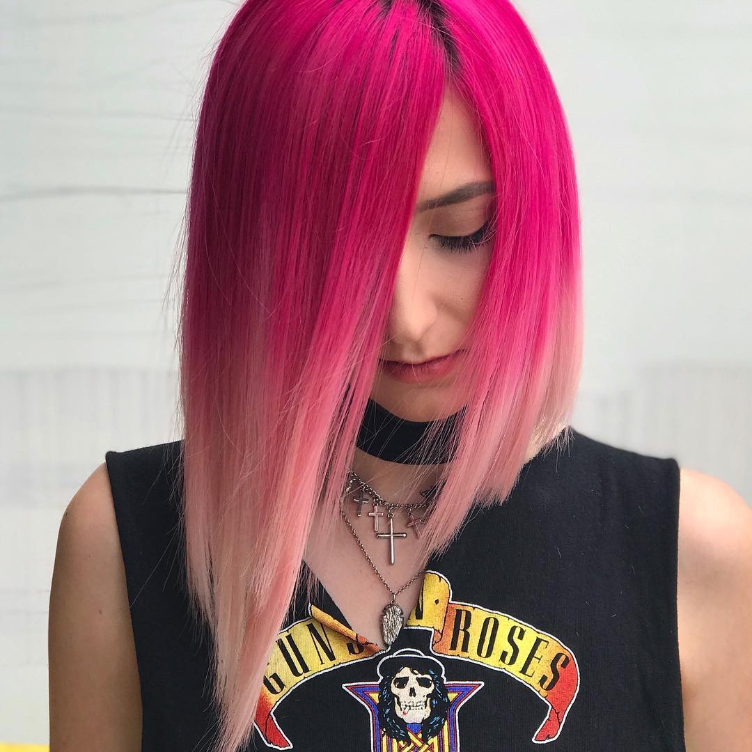 Here’s a great, new color combo designed for rock-rebels and art-students! And this vibrant blast of fuschia is a fab alternative to the same-old, platinum-blonde hair uniform of rock-chicks. The black roots are still in place, but the vivid color fading expertly into a trendy, salmon-pink is fresh. This bright, straight style is a subversive and easy-care version of the angled bob!
